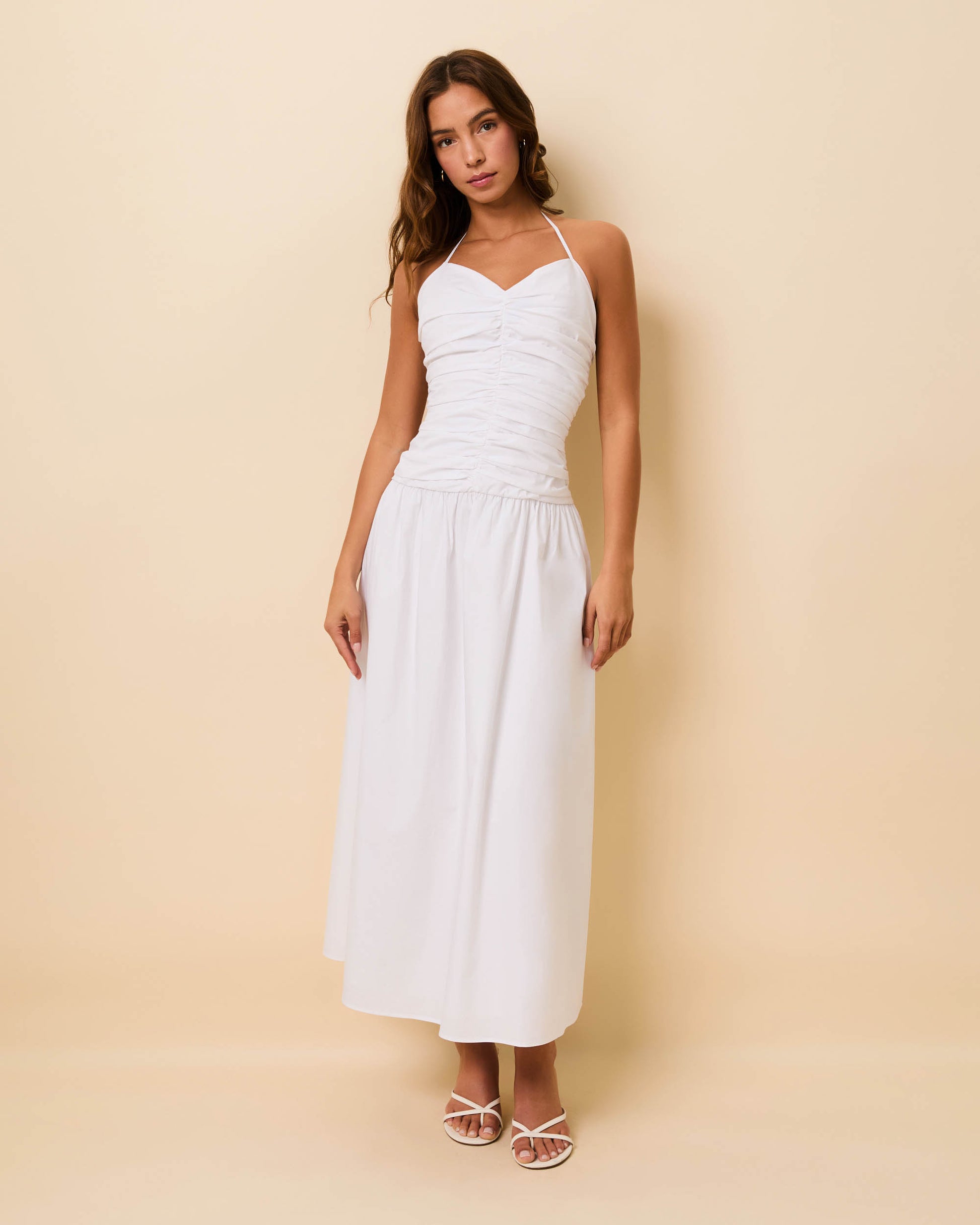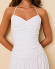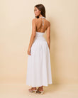 The Adina Dress is a stretch cotton poplin midi dress featuring a ruched bodice and a halter tie neck with sleek silver-toned metal cord ends. The silhouette is defined by a full, voluminous skirt that offers natural movement. This piece includes an invisible side zipper closure for a clean finish. Pair this dress with a simple sandal for a refined look.