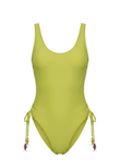 The Aven One Piece is simple silhouette with a twist, featuring a rounded neck, low-scoop back and adjustable sides with ties at the hips that allow a hi-cut leg and moderate to cheeky coverage on the bottom. The ties feature hand-beaded fish charms at the ends.