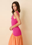 The Camila Dress in Orange Soda and Paradise Pink is sleek and sexy pull-on knit dress. This color-blocked maxi dress features a drop waist and a flowing flare skirt and an elegant curved seam. A modern twist with a more squared neckline and a low scoop back adds a chic, contemporary edge to this vibrant statement piece.