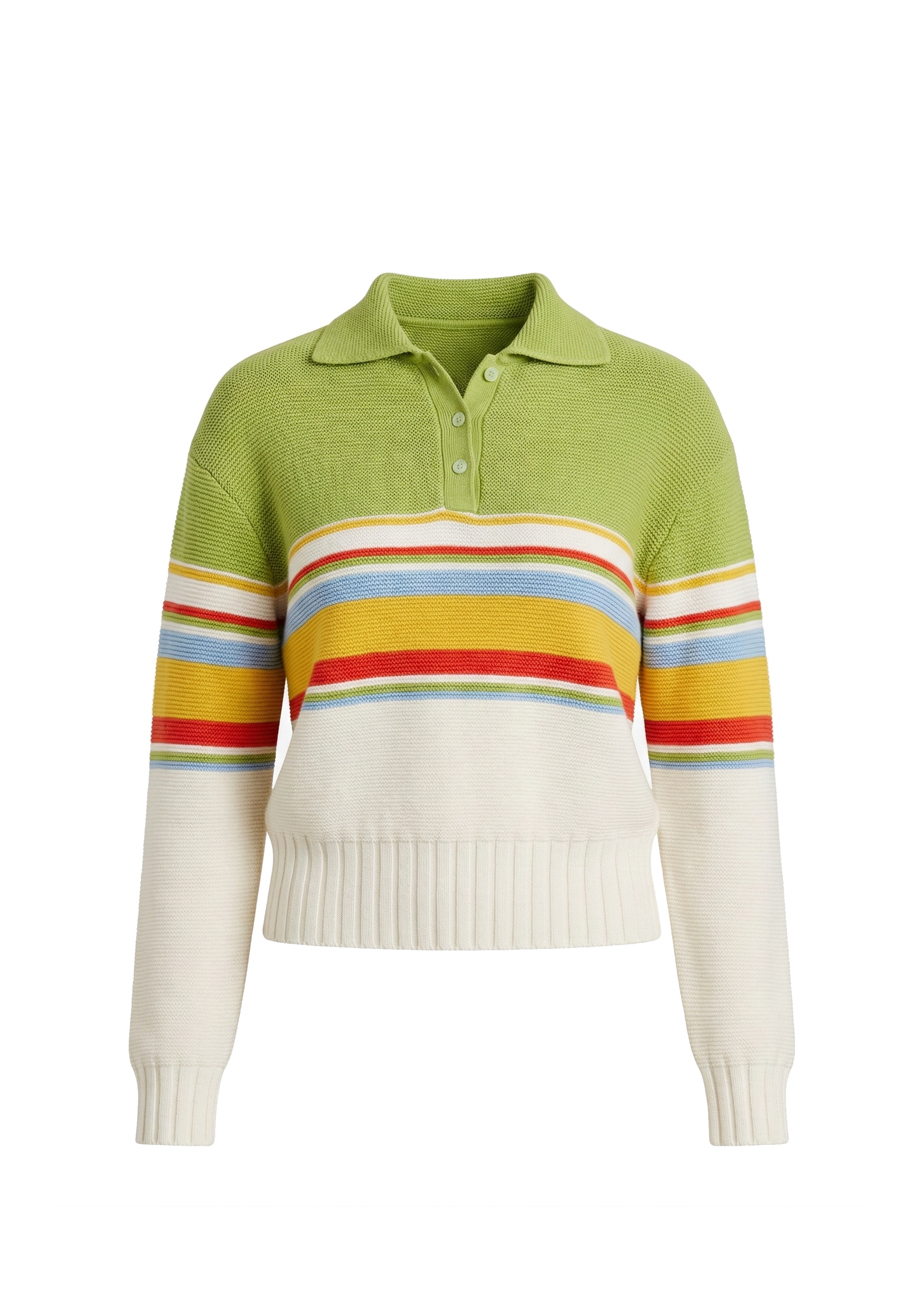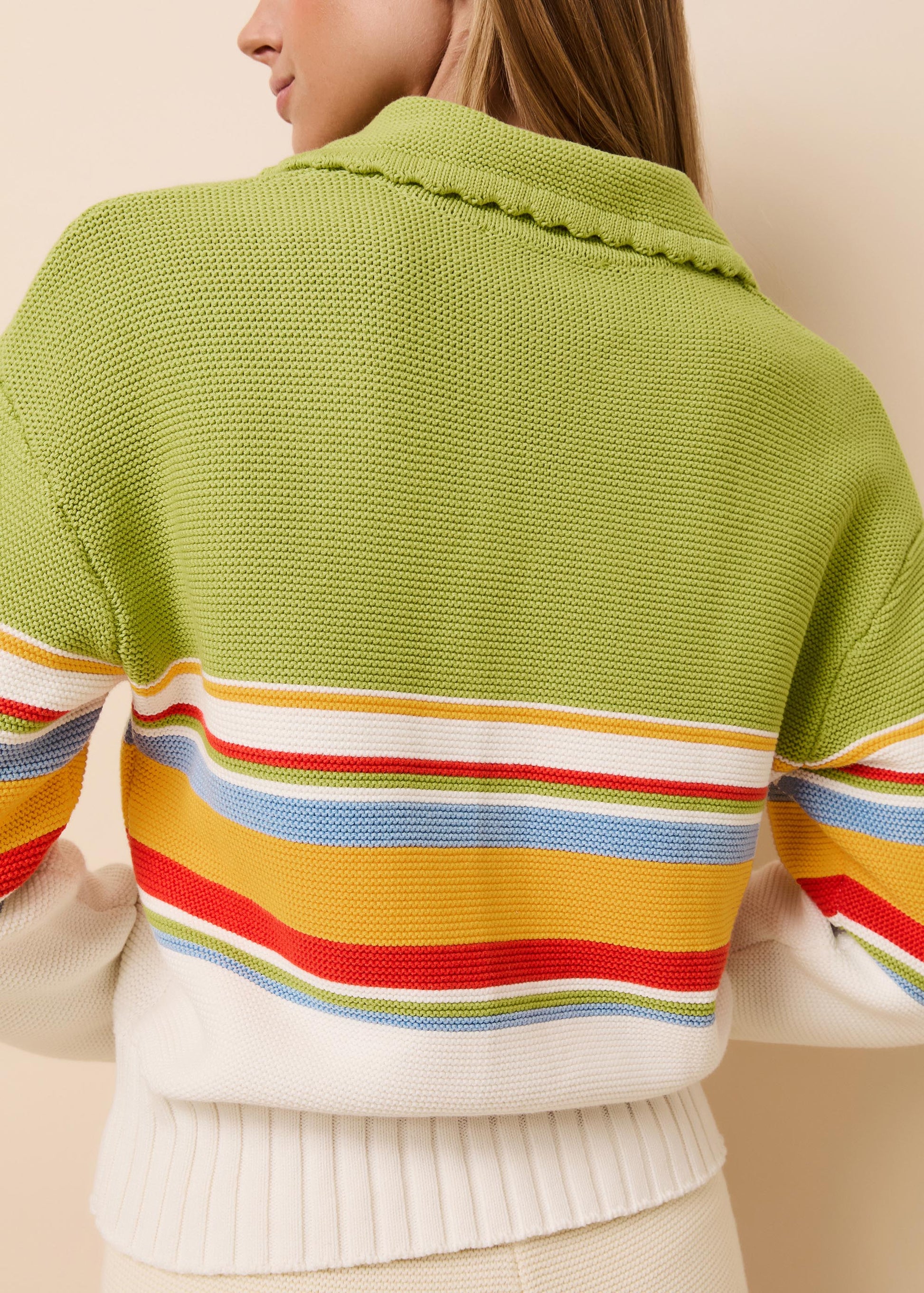 The Cleo Pullover St. Barths Stripe is polo-style knit top. Crafted from a soft cotton-knit blend with reverse jersey construction, it features a 3-button closure and scalloped detailing at the collar, drop shoulder and relaxed fit. Perfect for easy styling and effortless wear. Style with the matching Celeste Skirt or your favorite denim.