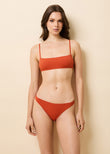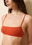 The Daniela Bikini Top is a minimal-coverage bandeau crafted from textured cable jacquard fabric for a unique, elevated feel. Featuring adjustable straps for a customizable fit, it pairs perfectly with the matching Daniela Bikini Bottom for a bold, coordinated look.