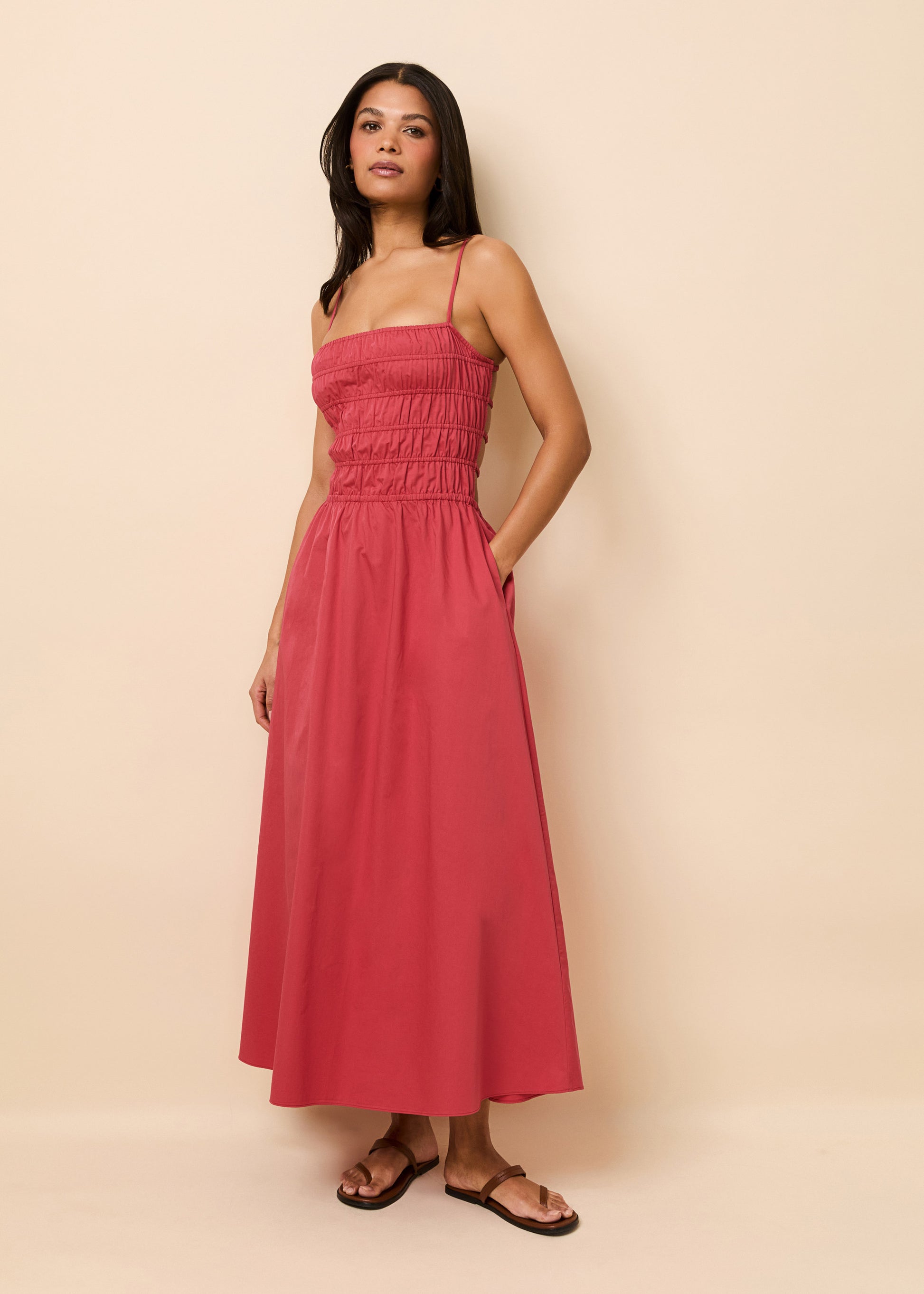 Our best-selling Delta Midi Dress in a classic stretch cotton poplin. The smocked bodice front and full relaxed skirt offers a flattering fit for all figures. This silhouette has adjustable straps, pockets, and an exposed back with elastic straps for optimal fit.