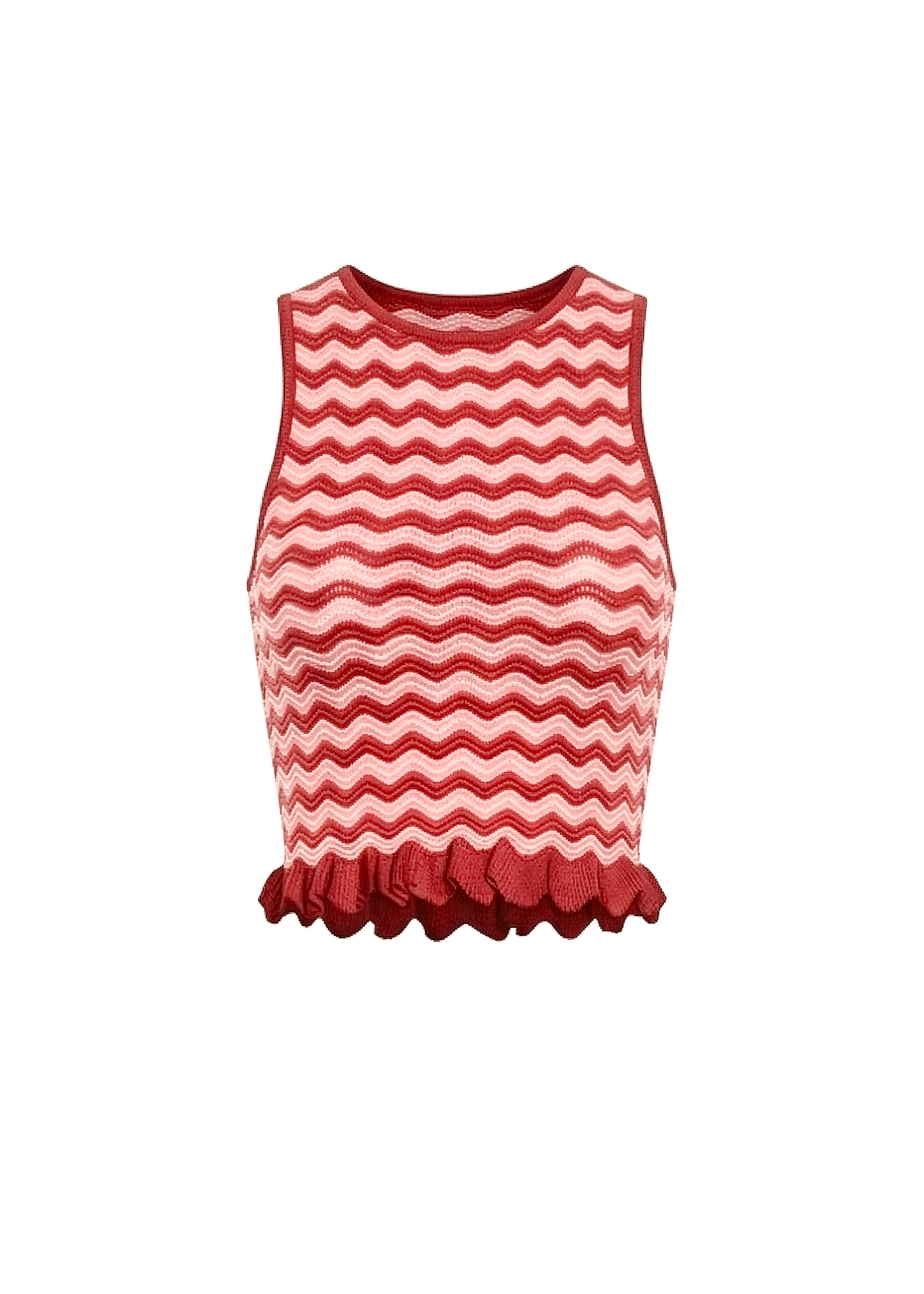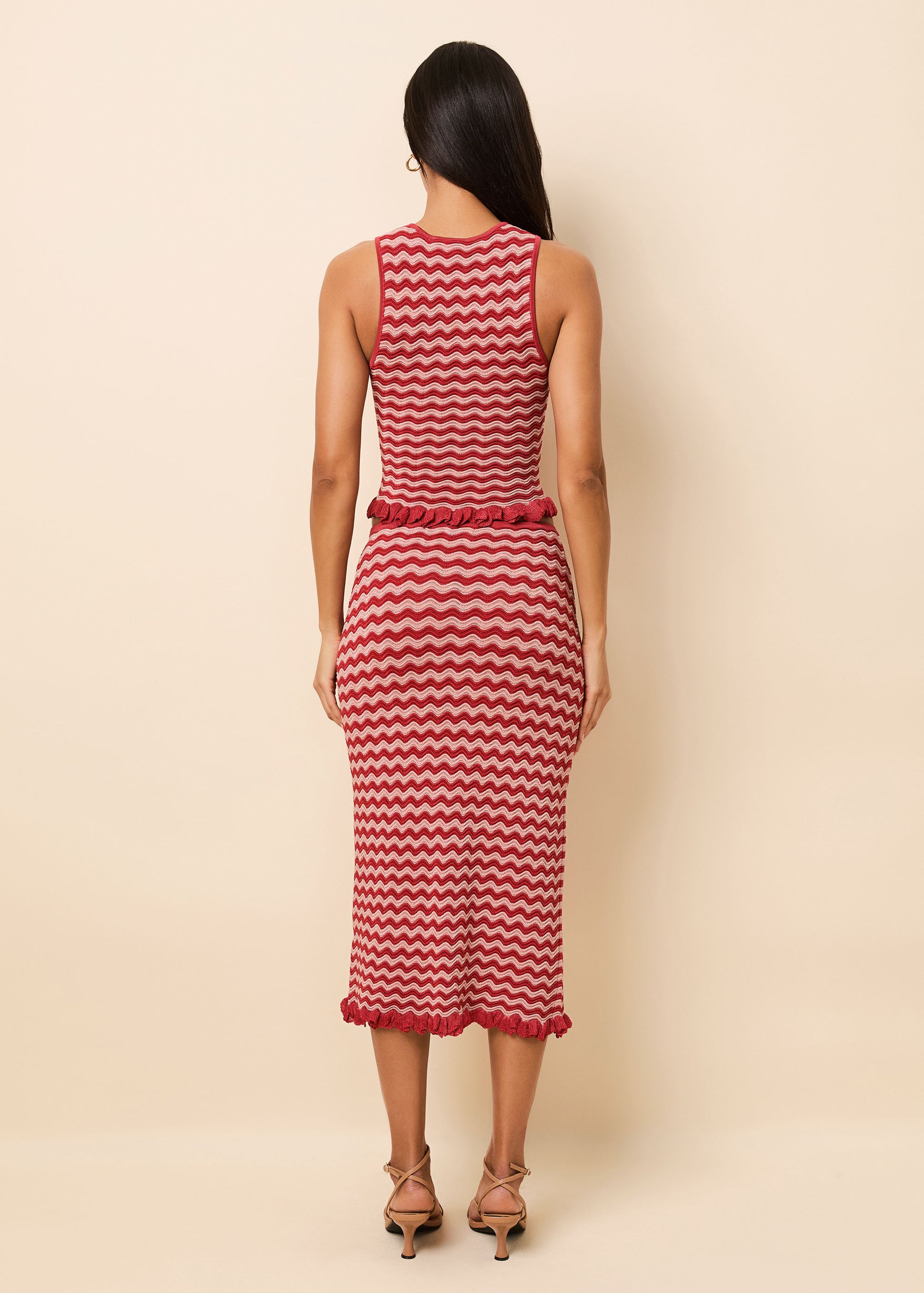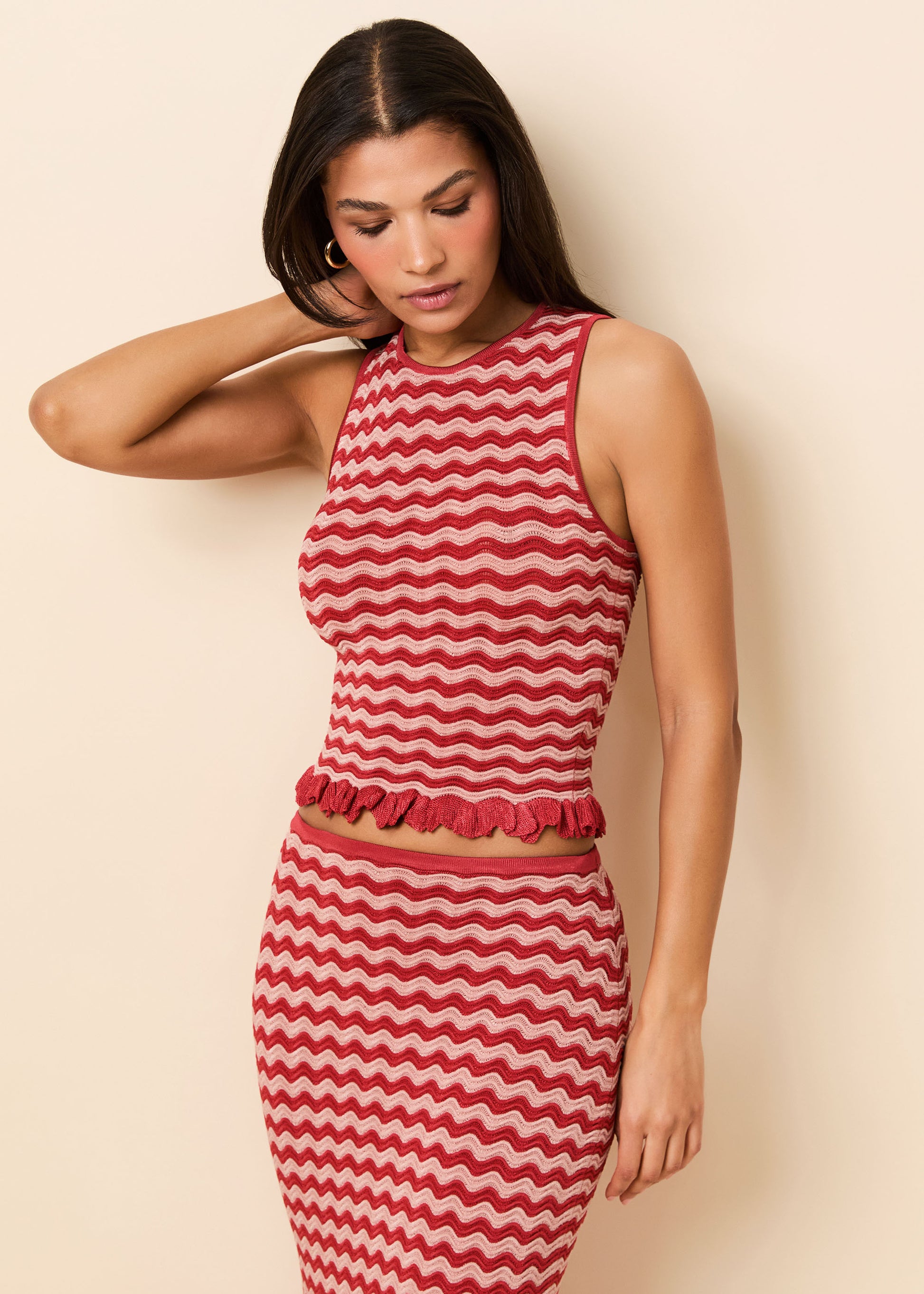 The Diana Top is defined by its graphic contrast and textural finish. Crafted from a wavy rib knit, this sleeveless tank features a body-skimming silhouette and a moderate cropped length.