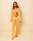 The Dolly Pant is a lightweight, mid to low-rise coverup pant in our soft mesh fabrication. Featuring a vertical stripe pattern, the construction is intentionally semi-sheer for layering over swim. It is designed with a functional tie-front closure and a slight flare at the hem for a relaxed, airy fit. Pair this piece with the Dolly Tie Top for a coordinated look.