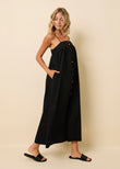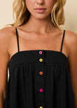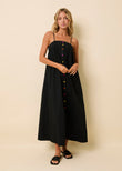 The Frances Dress is an elegant maxi with a flattering empire waist that flares gracefully from the bust, creating a timeless silhouette. It features a clean neckline and adjustable straps for a perfect fit. Functional colorblock buttons run down the front of the dress, adding a modern touch to this classic style. Effortlessly chic, the Frances Dress is perfect for any occasion that calls for understated sophistication.