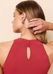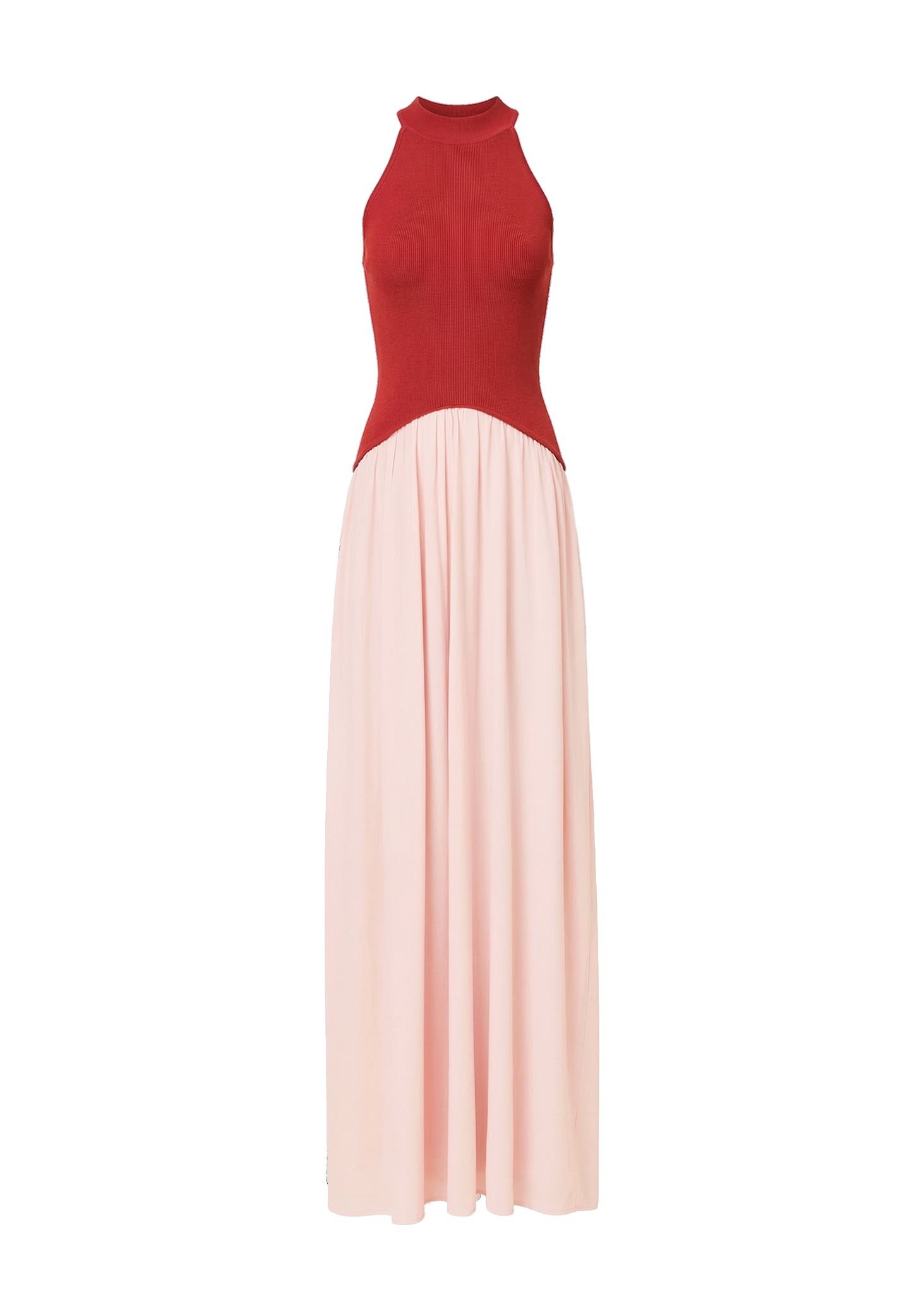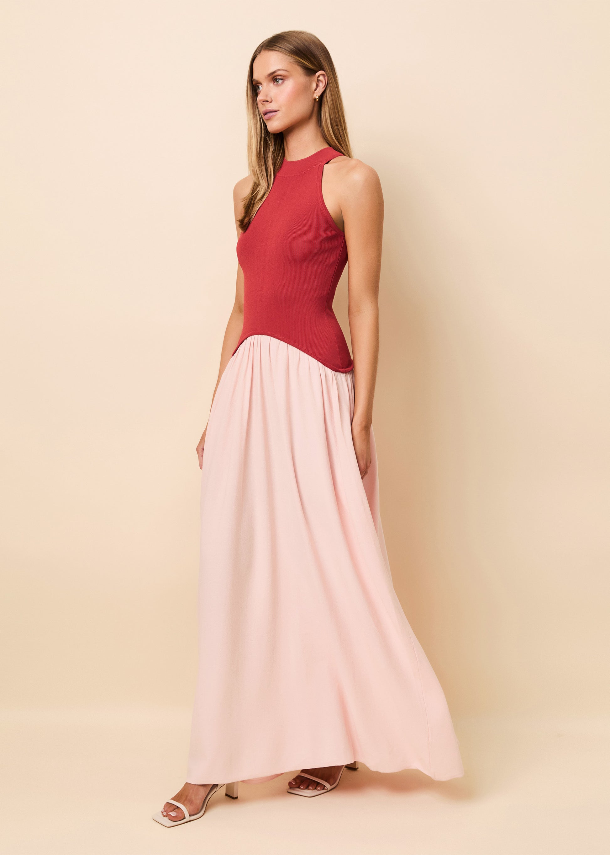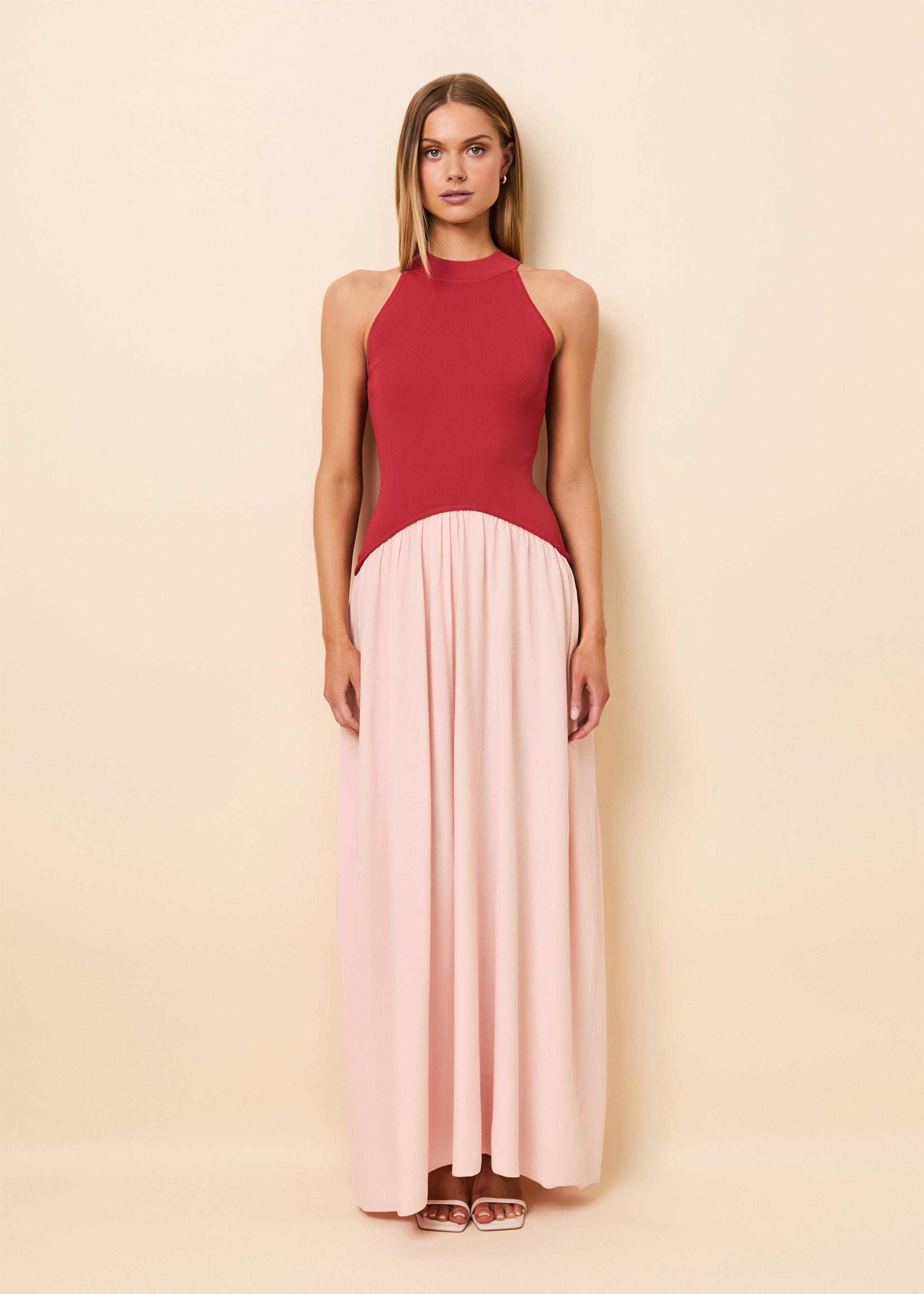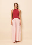 The Isola Dress is a knit maxi dress featuring a fitted bodice and a closed back with a three-button keyhole closure at the neck. The silhouette is defined by a drop waist that transitions into a shirred, lightweight skirt. This dress is a color blocked style with a soft red bodice and soft pink skirt. Style with a neutral sandal for a streamlined look.