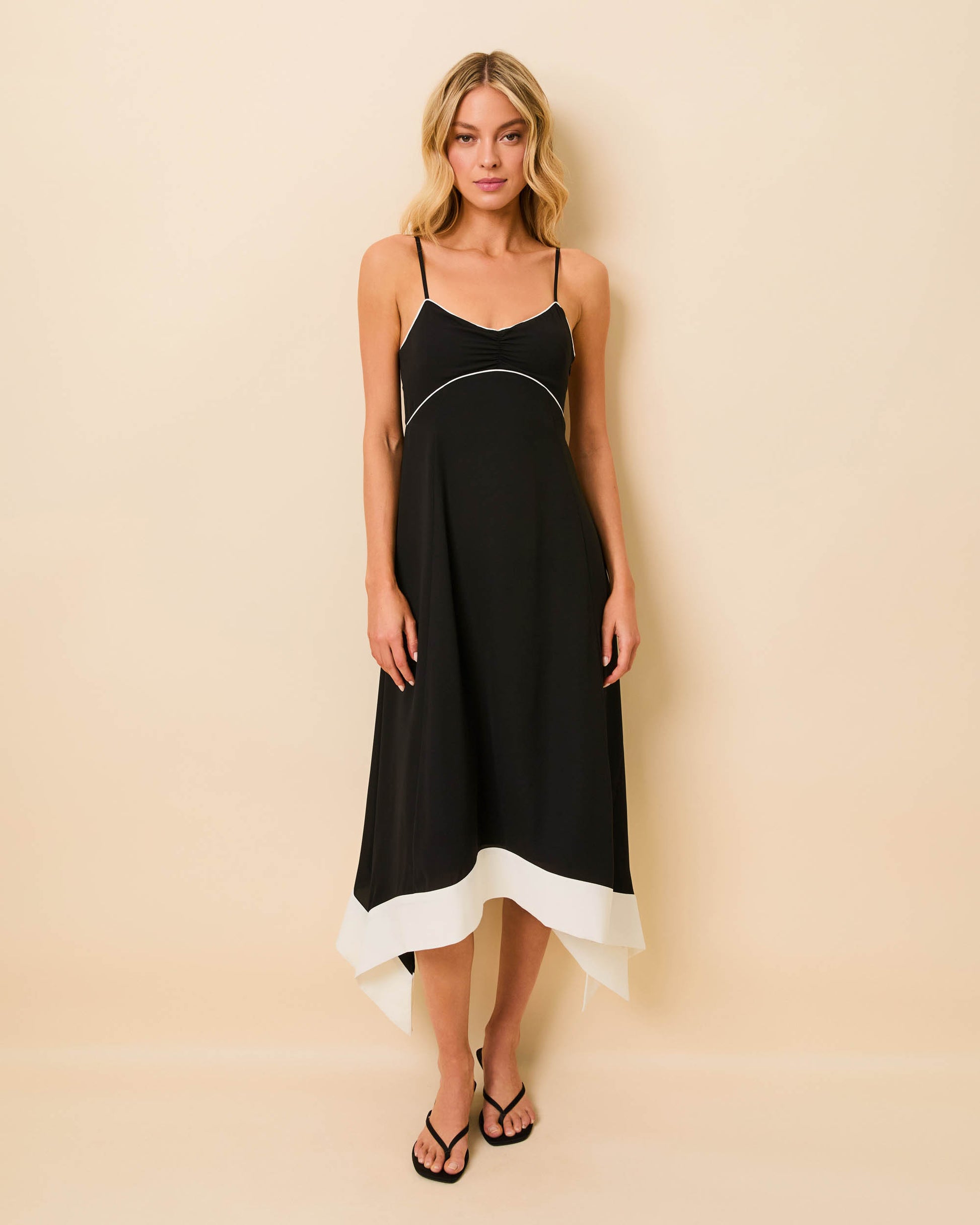 The Lennox Dress is a midi-length style in our Luxe Drape fabrication. This lightweight, wrinkle-resistant fabric is designed for a fluid, easy fit. The dress features center front shirring at the bust and contrast piping along the underbust, mirrored by a contrast colorblock stripe at the hem. The silhouette includes a curved, handkerchief-style hemline with side slits for natural movement. It is finished with slim adjustable straps, invisible side zip and a smocked back panel to ensure a comfortable fit. Pair this piece with a tonal heel for a polished, minimalist look.