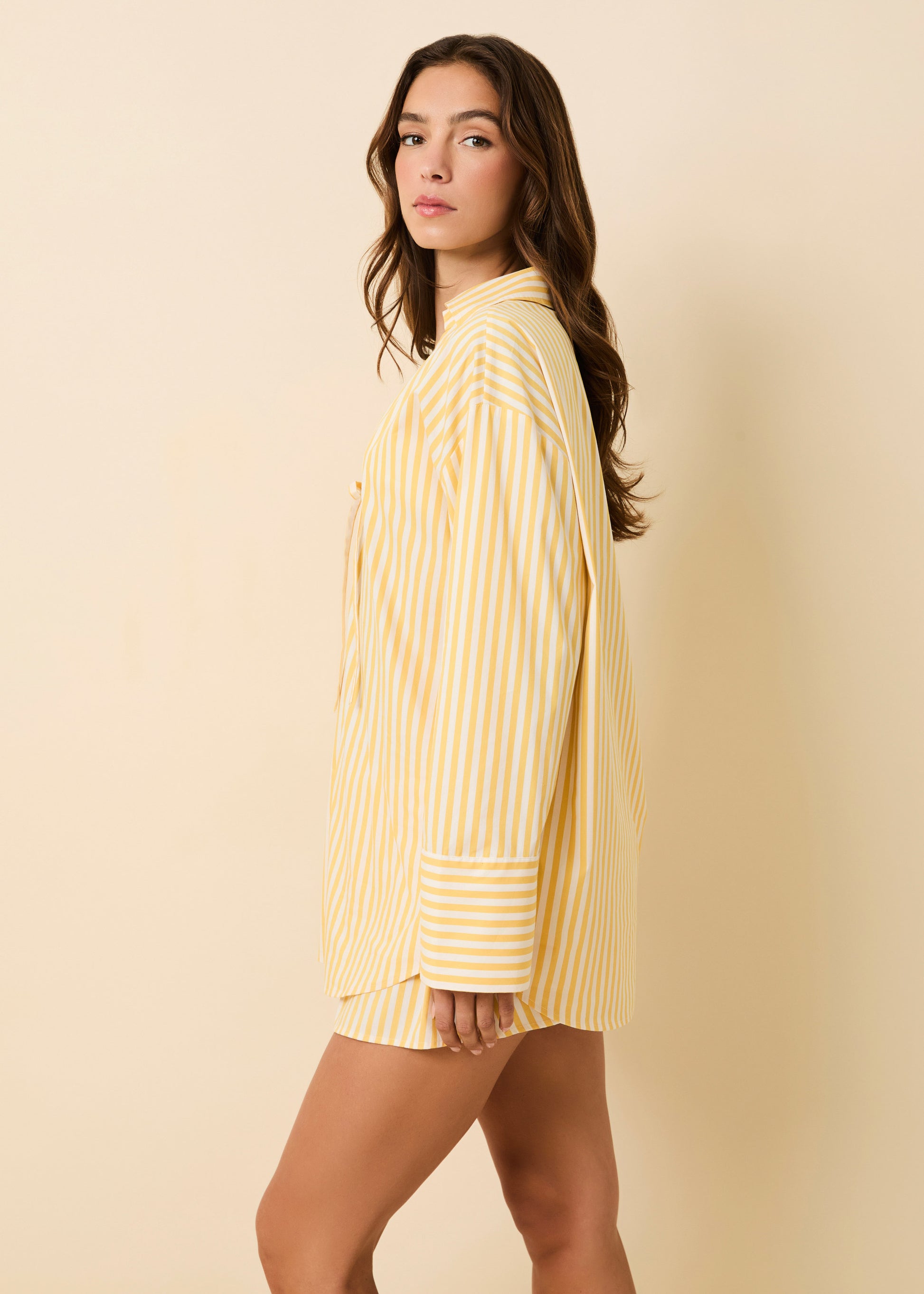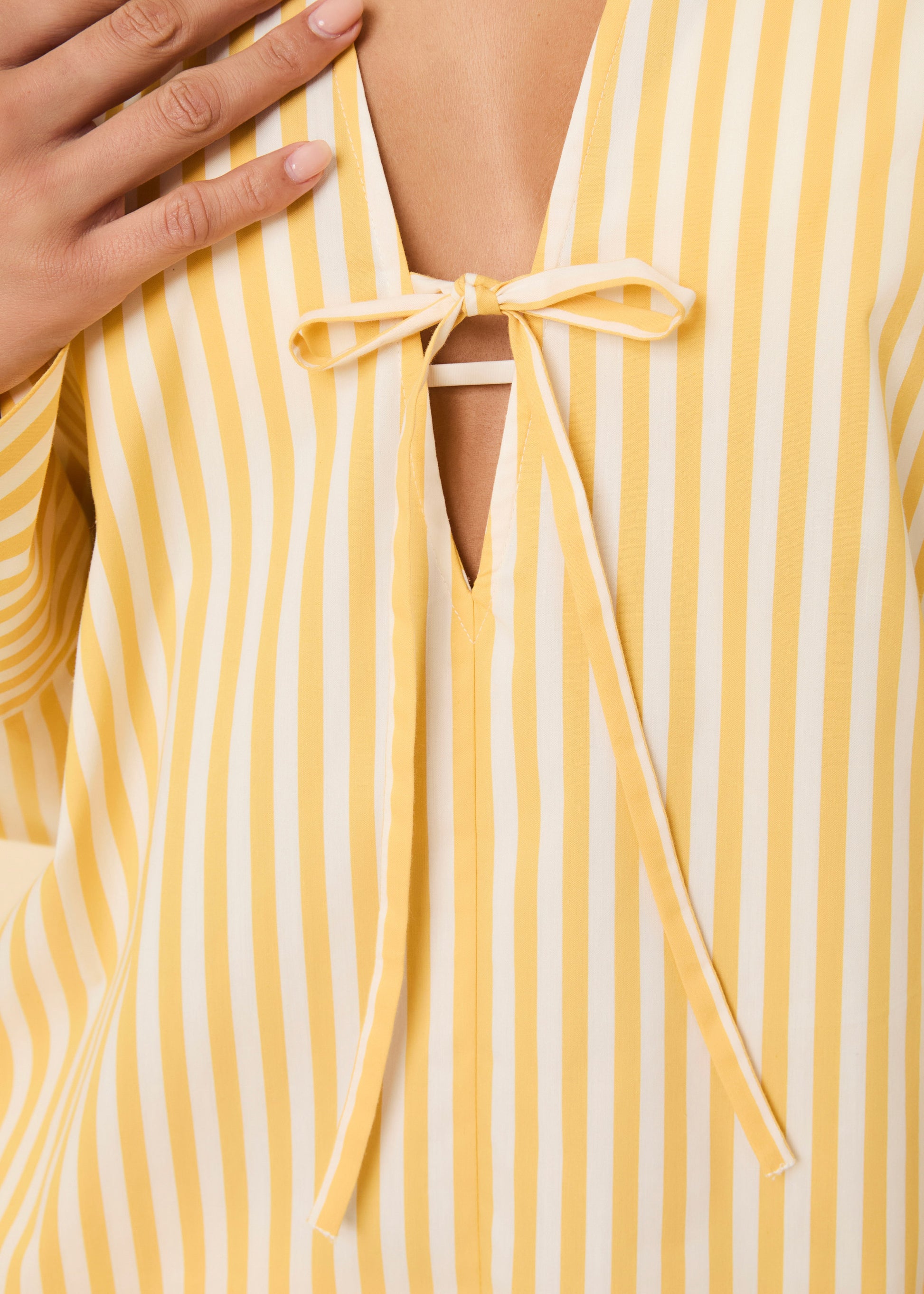 The Livia Tunic in Lemon Drop / Brule offers a warm, sun-washed take on this versatile silhouette. The deep V neckline with a tie detail, wide cuffs, and flowy high-low hem add to its laid-back appeal. Wear it on vacation or all season long as a sunny statement piece. Pair with the matching Brinley Skirt for fun and playful look.