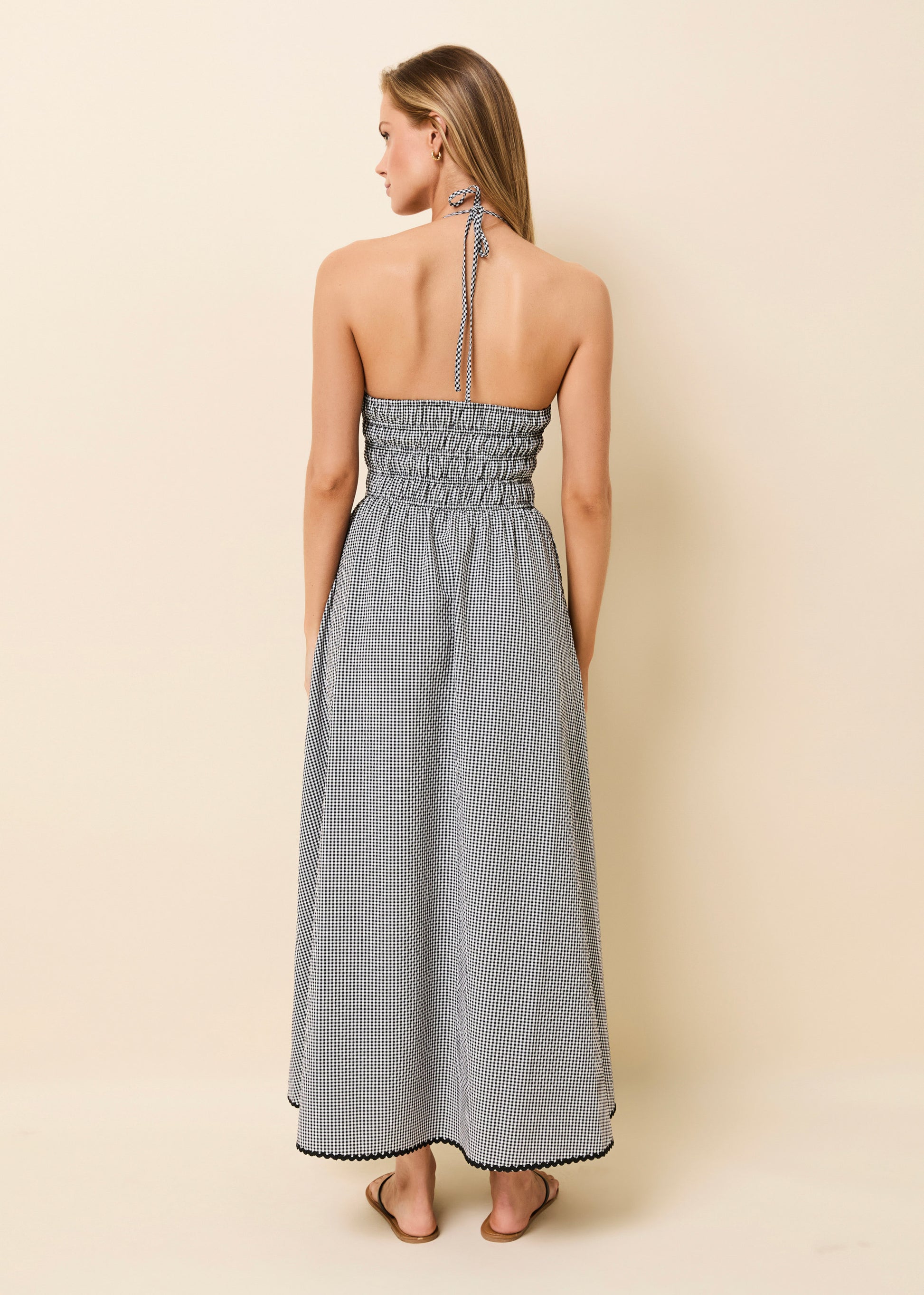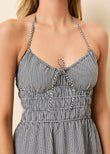The Lolita Dress is a charming warm-weather staple. Featuring a fully smocked bodice with separated woven cups, it offers a flattering, flexible fit. A delicate front bow detail and adjustable halter tie allow for customizable cup placement, while front pockets add a practical touch. Perfect for effortless summer styling.