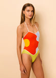The Lumi One Piece is a halter-style swimsuit featuring a bold, floral colorblock design, white contrast binding and ties, and moderate to cheeky coverage at the back.