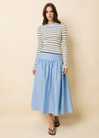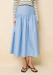 This midi skirt is designed with a clean, wide waistband and structured facing for a polished, flattering fit. The A-line silhouette is complemented by a gathered full skirt, offering soft volume and elegant movement with every step. Finished with an invisible side zipper, it’s a versatile piece that transitions effortlessly from day to evening. Pair with the matching Cropped Avril Top.