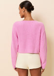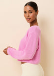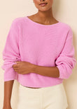 Our Meg Sweater in Bon Bon combines cozy comfort with modern style. Crafted from a chunky cotton blend, this relaxed-fit sweater features balloon sleeves, a boat neck, and drop shoulders for an effortlessly chic silhouette. The full-length design is finished with a classic cardigan stitch, making it the perfect layering piece for cooler days.
