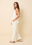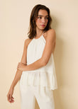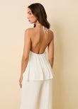 The Mia Top in Brule is a sleek, summer-ready halter crafted from an anti-wrinkle fabric for easy wear and care. It features an adjustable tunnel neck tie and a low, open back with elastic for a secure and flattering fit. The lined bodice offers comfortable coverage, while the drapey peplum hem—curved and slightly longer in the back—adds a feminine, flowy finish. Pair it with the matching Monaco Pant for a polished, coordinated look.