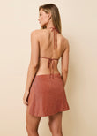 The Mini Wrap Pareo is updated in our shimmering Lurex fabrication in Spice. Featuring a side tie, it’s lined for added comfort and designed to elevate your beach look with a touch of sparkle.
