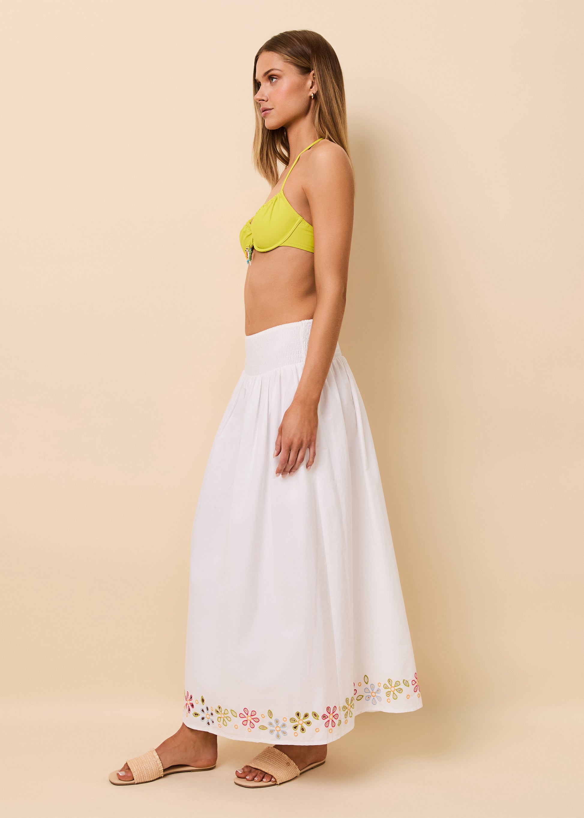 The Noreen Skirt is a flowy pull-on midi skirt crafted from crisp poplin. Designed for effortless wear, the skirt features a smocked waistband, multicolor floral eyelet embroidery at the hem and side pockets. This style is lined.