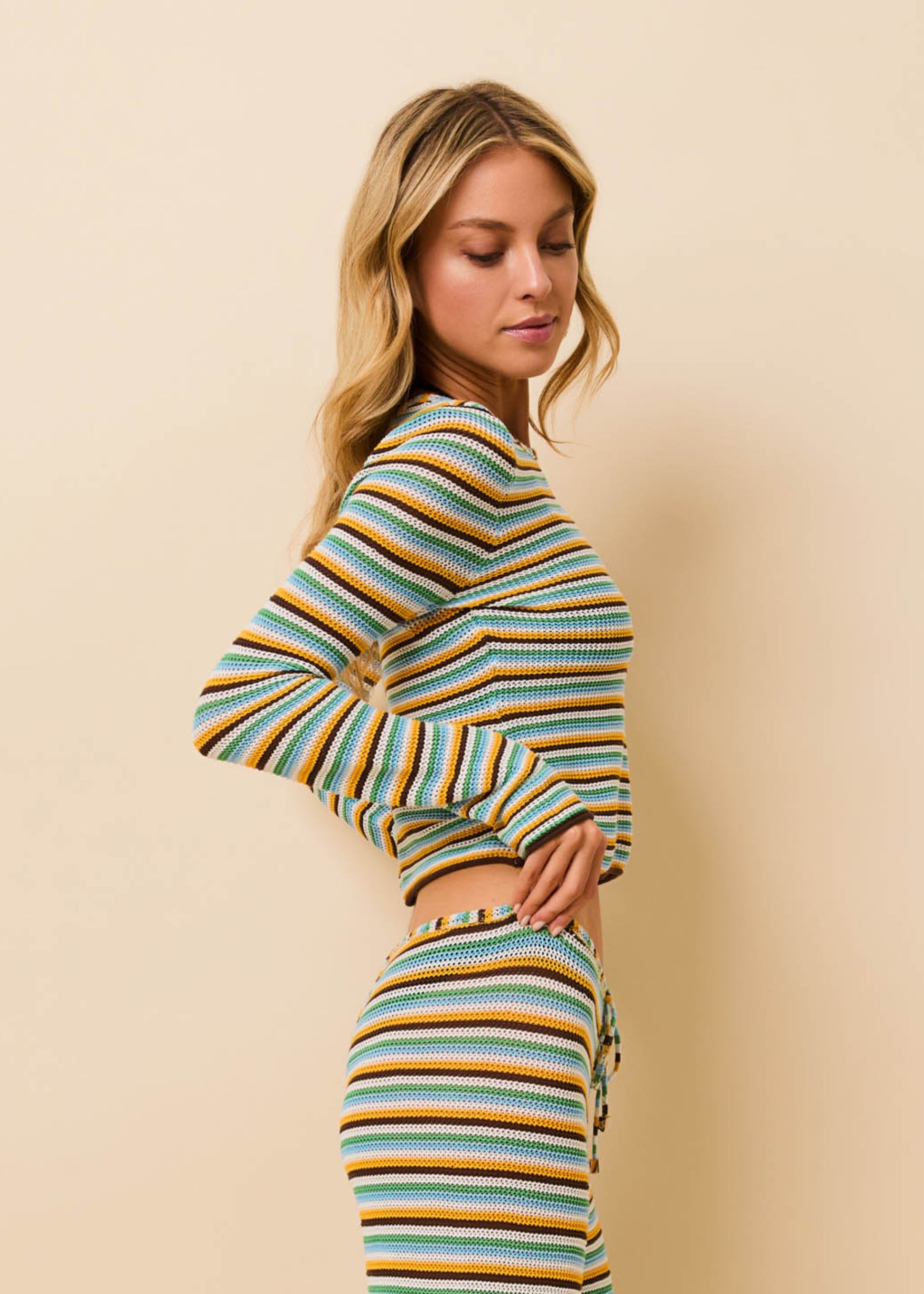 The Olandria Top is a fitted, long-sleeve cover-up, knit top in an open cotton knit. The Olandria Top features a crew neck. Wear it with the matching Ayden Pant and over your favorite swim.