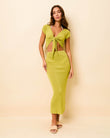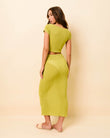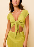 The Rianne Tie Top is a cropped, short-sleeve cover-up top in our Paper Knit—a matte, fine-gauge ribbed knit. The construction is semi-sheer, featuring a functional tie-front closure. It is designed for a body-skimming fit that allows for adjustable coverage over swim. Pair this piece with the matching Rianne Skirt for a cohesive, warm-weather look over your favorite swim.