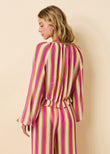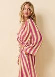 The Seraphina Top in South Beach Stripe features a fresh new fabric perfect for transitional styling. This long-sleeve top offers elasticated cuffs and a flattering tie-front design with ruffled detailing at the hem. The cropped front creates a subtle V shape, complemented by an open neckline for a breezy, feminine look. Effortlessly chic, the Seraphina Top adds a stylish edge to any outfit. Pair with the Ashling Pant for a breezy matching look.