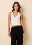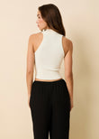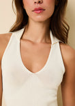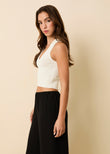 The Shelby Knit Top in Brule is crafted from a lightweight, classic viscose knit for easy elegance. It features a deep V-neckline, closed back, and ribbed collar with a flattering rib at the waist sweep. The chest showcases a flat Hershey stitch detail, while fully fashioned side seams with jersey stitching create a sleek silhouette. This sleeveless, full-length top is both comfortable and versatile, allowing you to wear a bra with ease. Complete the look with the matching Celeste Skirt.
