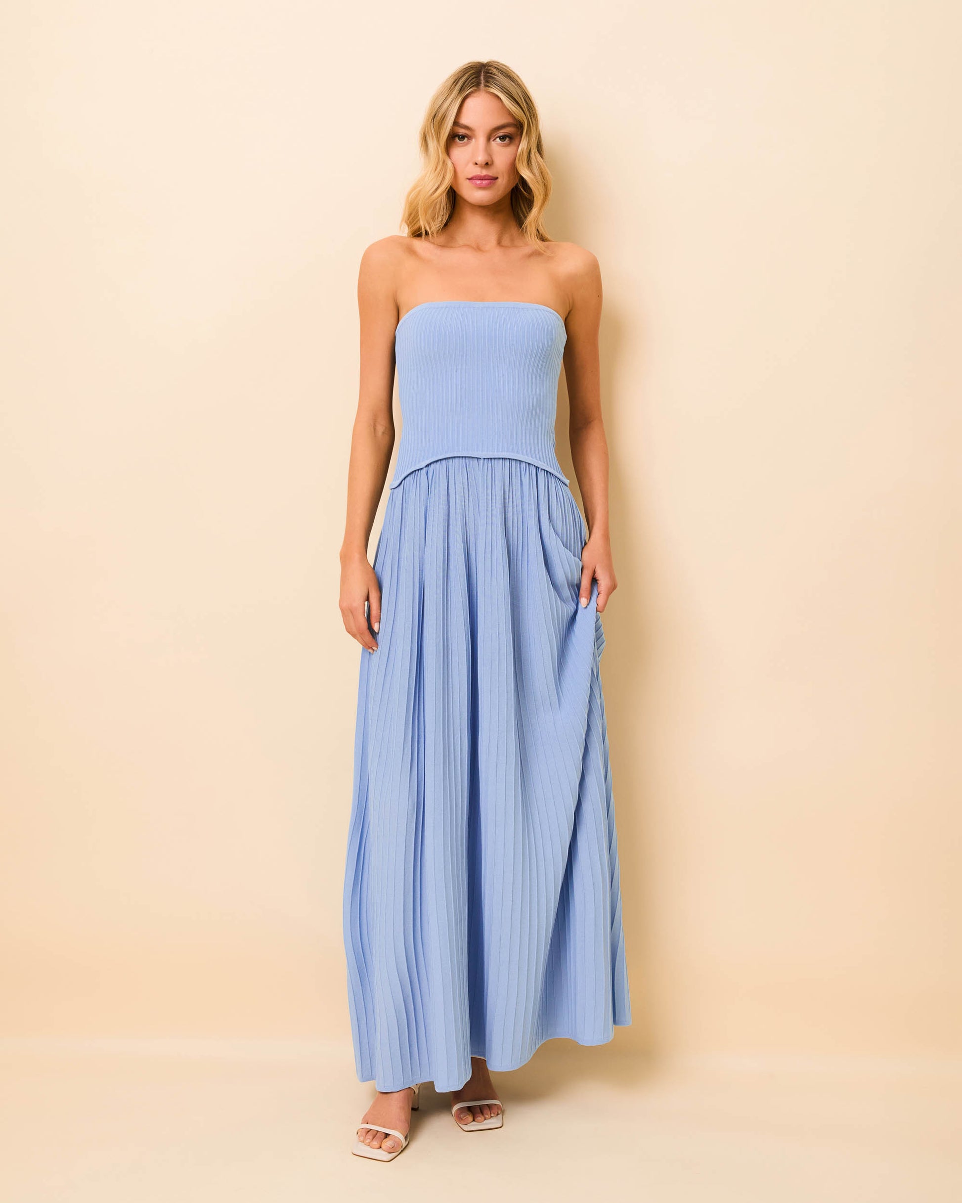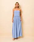 The Strapless Soglio Ribbed Knit Dress in Blue Lagoon is a maxi dress silhouette that features a fitted, strapless top and a softly shirred, lightweight knit skirt, creating an effortlessly refined look. The perfect blend of comfort and elegance, it's a must-have for any warm-weather occasion. This style is pull-on and has no hardware.