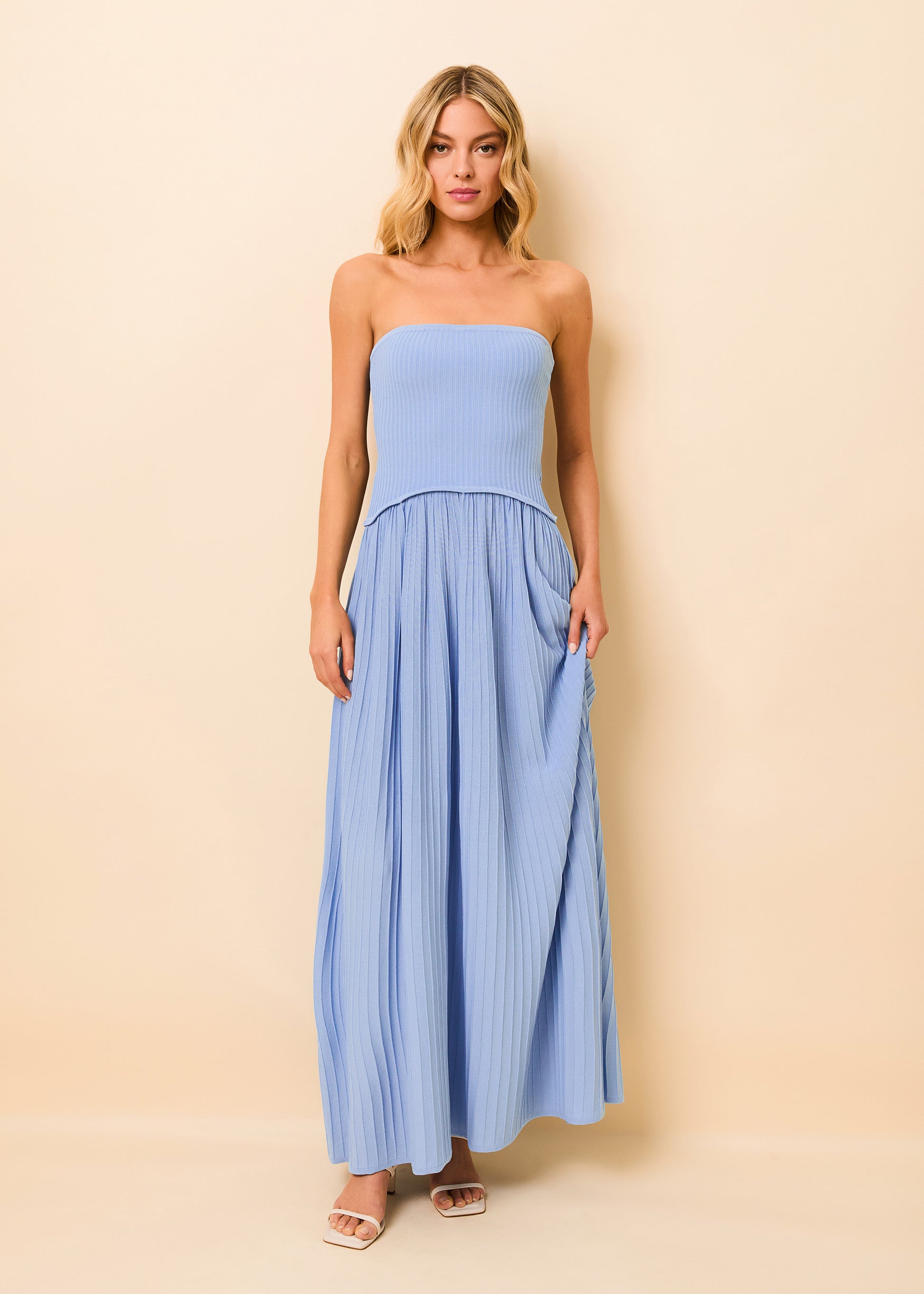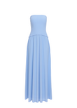 The Strapless Soglio Ribbed Knit Dress in Blue Lagoon is a maxi dress silhouette that features a fitted, strapless top and a softly shirred, lightweight knit skirt, creating an effortlessly refined look. The perfect blend of comfort and elegance, it's a must-have for any warm-weather occasion. This style is pull-on and has no hardware.