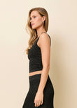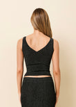 The Tabitha Top is a fitted, full-length silhouette featuring V necklines at both the front and back. Made from lurex fabric and finished with specifcally engineered ribbing for a clean, sculpted look that flatters and fits close to the body. Pair with the Thersa Skirt.
