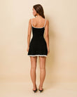 The design is framed by two-tone noir and brule binding along the neckline and spaghetti straps, finished with a delicate ruffle trim at the hem. It’s a versatile, polished staple designed to transition effortlessly from day to evening. A standalone hero piece designed for a streamlined, monochromatic look.