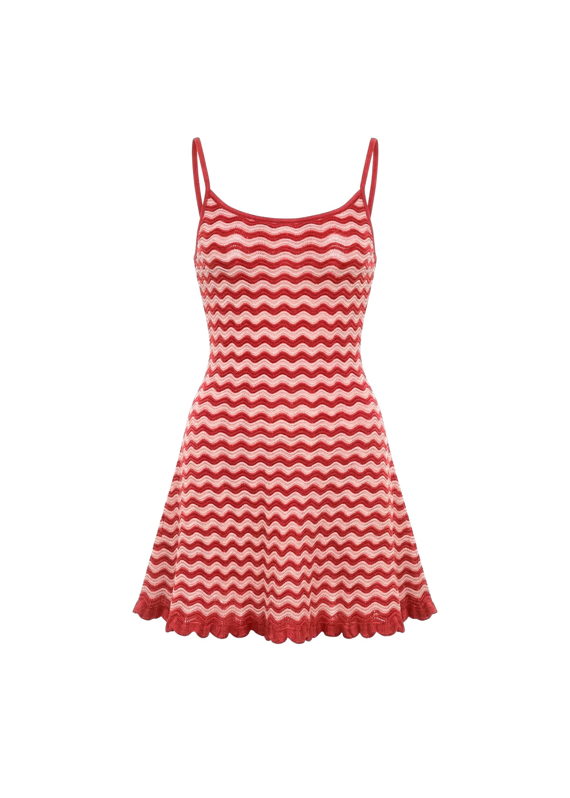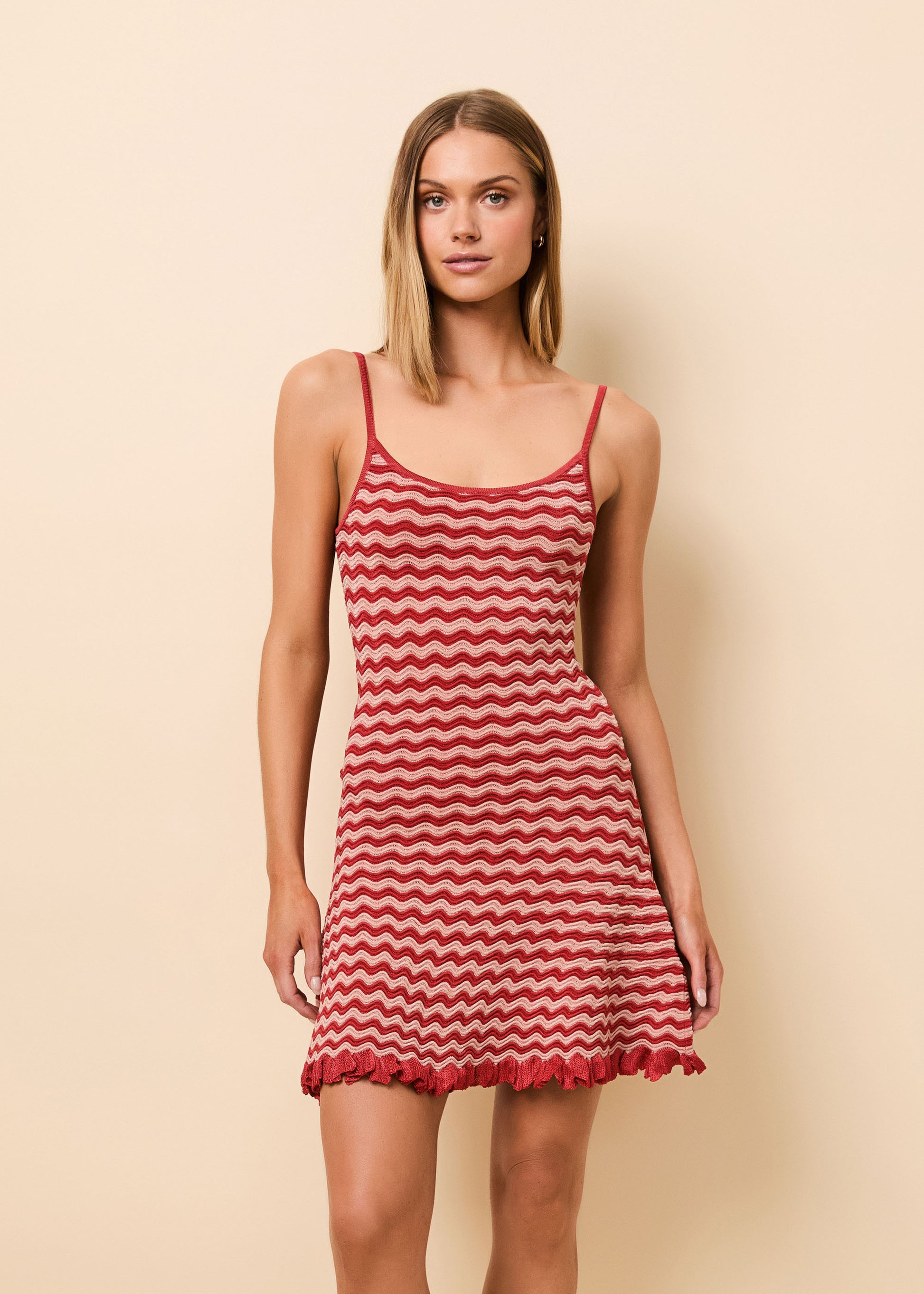 The two-tone striped design is framed by Rooftop Red binding along the neckline and spaghetti straps, finished with a delicate ruffle trim at the hem. It’s a versatile, polished staple designed to transition effortlessly from day to evening. A standalone hero piece designed for a streamlined look.