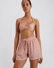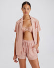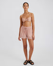 Made with comfort in mind, the Charlie Short is featured in classic subtle striping pairing back to The Dahlia Top. These high-waisted shorts offer an elastic waistband and functional pockets to compliment the boxer-style silhouette.