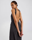 The Lou Dress, cut from our lightweight crinkle fabric, features a wide neckline, open back and a raw hem with a slit.