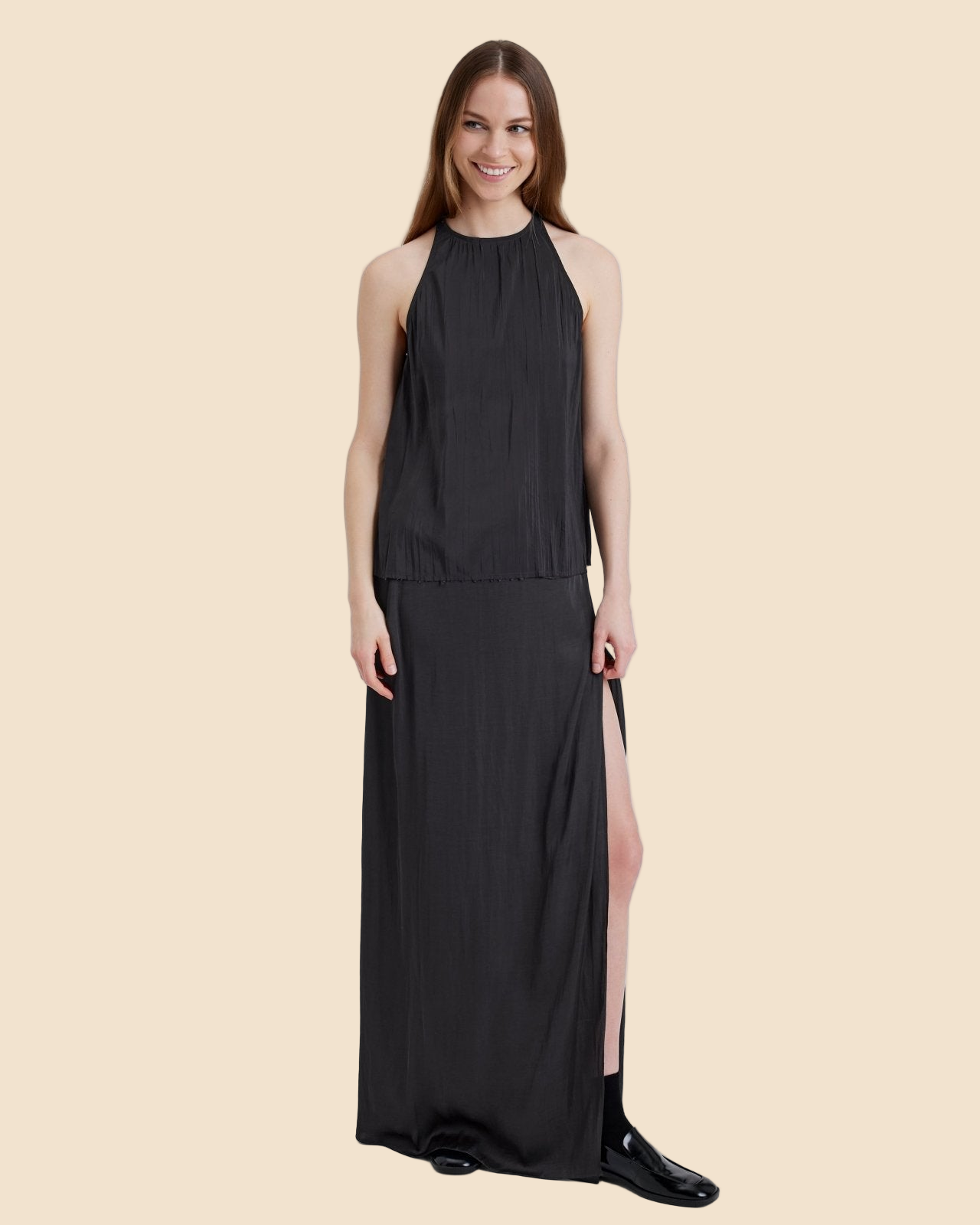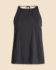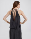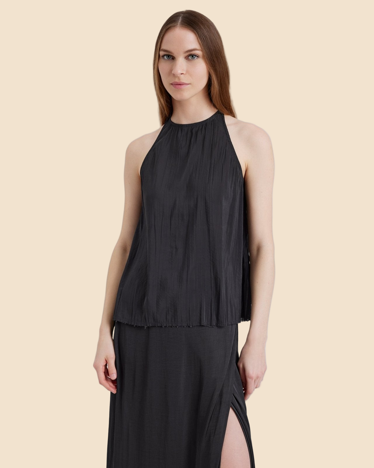 The Milly Top, made in our lightweight crinkle fabric, features a high neck with a deep v in the back and a raw hem. Pair with the coordinating Milly Pant or Leau Skirt.