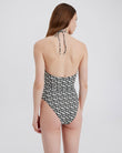 The Mina One Piece, designed in our horse print fabric, features figure-flattering ruching down the center, a halter neck tie and high cut hips.