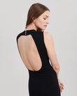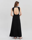 The Nadia Dress, made in our structured viscose knit, features a subtle v-neckline and an open back. Complete with three iridescent buttons at the back of the neck and a flattering A-line maxi skirt.