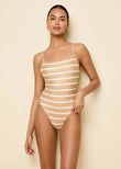 The Renna One Piece in Camel Stripe, featuring a slightly scooped neckline and high cut legs. Pair with one of our cashmere sweaters, or style it as a bodysuit.
