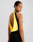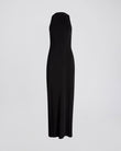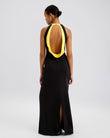 The Seleta Dress, designed in a matte jersey fabric, features a column silhouette, high neck and open back. The back opening has a draped contrast color and includes a seam split in the back of the dress.