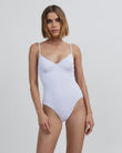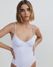 The Taylor One Piece made in a floral eyelet fabric. The ruched, underwire cups include a rick rack trim and adjust at the straps. Pair with the Oceane Linen Short.