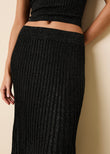 The Theresa Skirt is crafted from shimmering lurex fabric, offering a flowy yet form-flattering silhouette in a maxi-length design. Engineered ribbing creates a clean, sculpted fit that beautifully enhances the body. Perfect for effortless vacation style or a standout special event look. Pair it with the Tabitha Top for a chic, coordinated holiday ensemble.